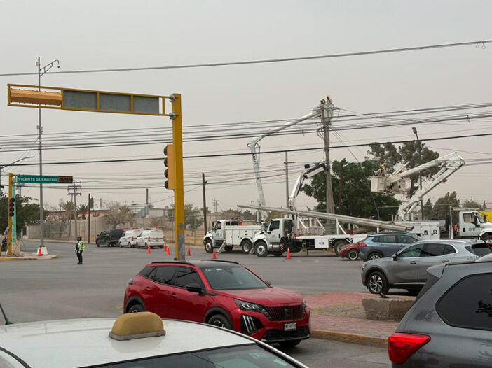 Los fuertes vientos que se abaten sobre la región provocaron una falla en el sistema eléctrico del cruce de las avenidas Vicente Guerrero y Tomás Fernández, lo que generó que los semáforos de ese crucero se apagaran.
