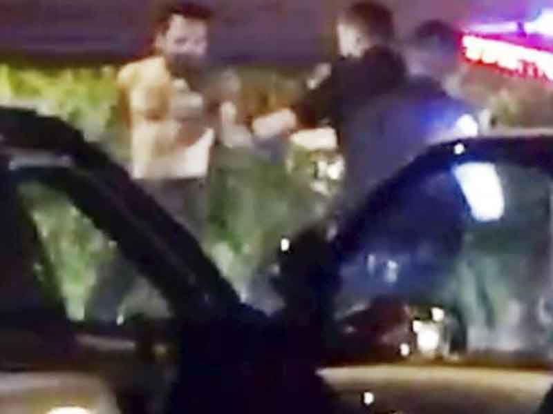 Un agente aferra la muñeca de Pérez y los dos giran. Otros agentes gritan "cuchillo". Se escucha un disparo y luego otro tres segundos después