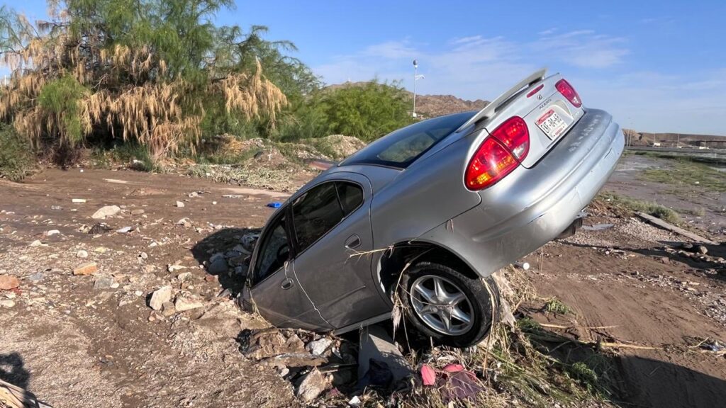 Ya en la ribera del río, en la colonia Franja Sara Lugo, un carro gris tipo sedán con placas de Chihuahua quedó sepultado de frente entre lodo, con solo las llantas traseras sobre la superficie.