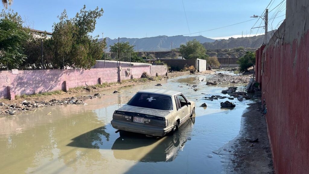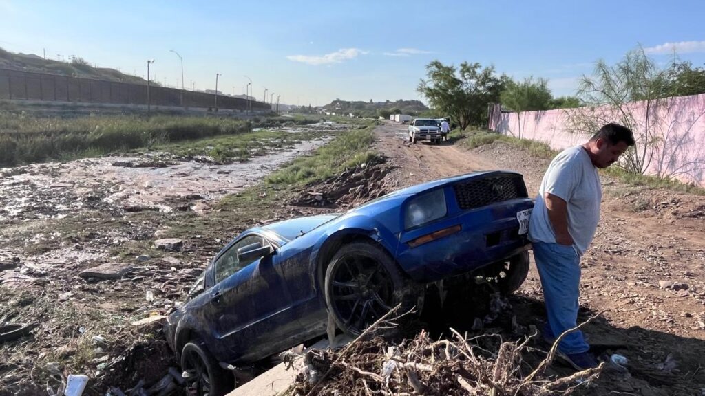 Calles arriba, en la colonia Ladrillera de Juárez, vecinos de la calle Canutillo caminaban entre la zona inundada y limpiaban el interior de sus vehículos, que también fueron arrastrados.