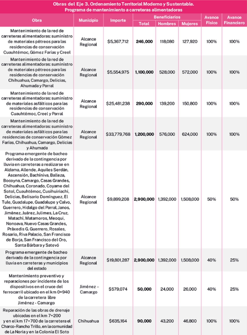 Como parte del programa de mantenimiento a carreteras alimentadoras, el estado de Chihuahua alberga 3 mil 651 kilómetros de carreteras alimentadoras en los 67 municipios. Esta red, en su mayoría, comunica a las cabeceras municipales con las vías troncales estatales y federales.