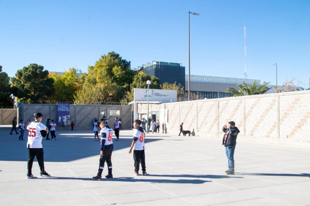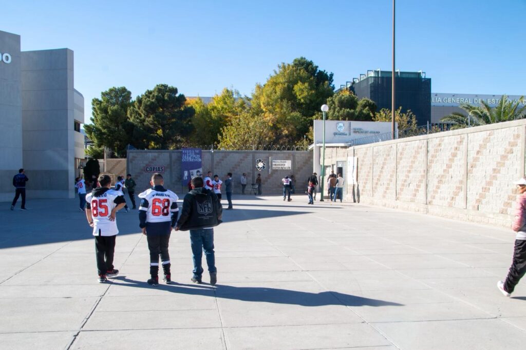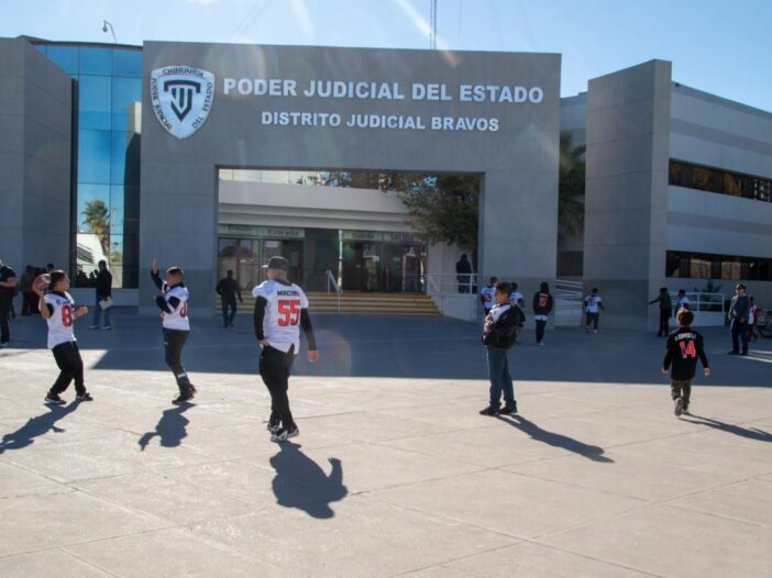 Durante la tarde de este viernes, en la explanada exterior de la Fiscalía de Distrito Zona Norte, que la conecta con los juzgados civiles, se apostó un grupo de menores de edad uniformados con una jersey blanca, números grandes en color rojo y resaltando la palabra “Juárez”, mientras que en la parte trasera lucen el apellido de cada uno de sus portadores.