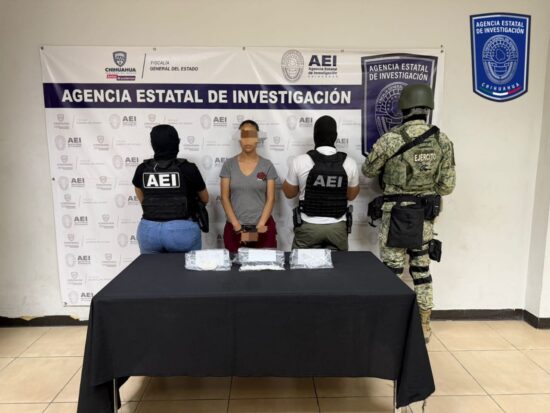 Una mujer de 32 años fue detenida por la AEI en posesión de más de mil dosis de cocaína en piedra y polvo; el operativo se realizó con apoyo del Ejército Mexicano