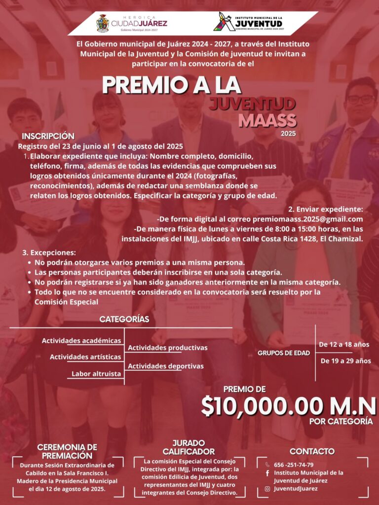 El Gobierno Municipal, a través del Instituto Municipal de la Juventud de Juárez y la Comisión edilicia de la Juventud, hicieron un llamado a la comunidad para que postulen a las y los jóvenes con talento para para recibir el Premio de la Juventud Maass, edición 2025.